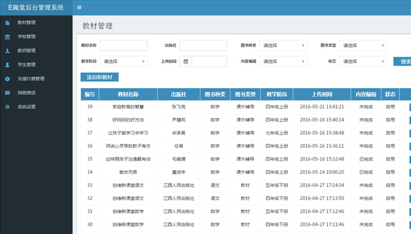 • 教材管理    管理平臺教材信息,采用圖片掃描、上傳、編輯對書本進行錄入